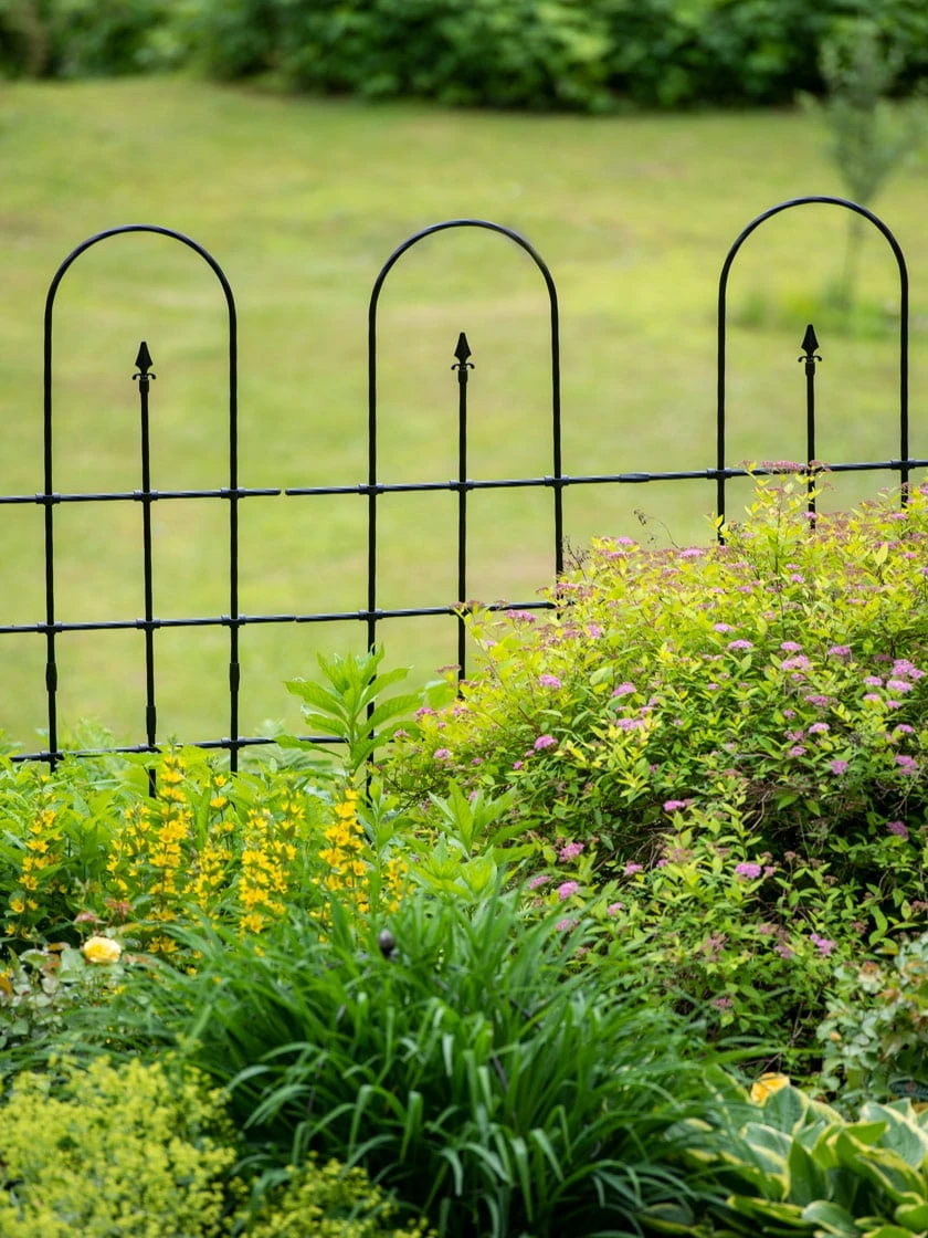 With its classic Roman arches and spear-shaped finials, this charming border panel provides an elegant garden backdrop on its own, or as a trellis, lightly twined with smaller annual vines. Sturdy steel-core design stands straighter and taller than comparable fencing, and polyethylene coating is gentle on plant stems. Setting up and expanding your border by adding more segments is easy too: each double-arch panel connects to the next with the included connector clips.