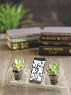 Plants make you happy, music makes THEM happy! Hand blown glass makes a fantastic natural amplifier, without messy cords. Twin 2-1/2″ planter cups flank a phone port designed to fit even the biggest smartphone and case. Perfect for singing sessions in the shower!