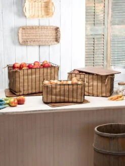 Root vegetables keep longer when they’re stored in the dark and have good air circulation. These wire bins have natural, air-permeable jute liners that block light. Sturdy mango wood lids are not only attractive but provide a solid surface for stacking. They nest for even more compact storage too!
