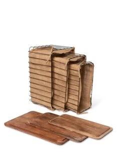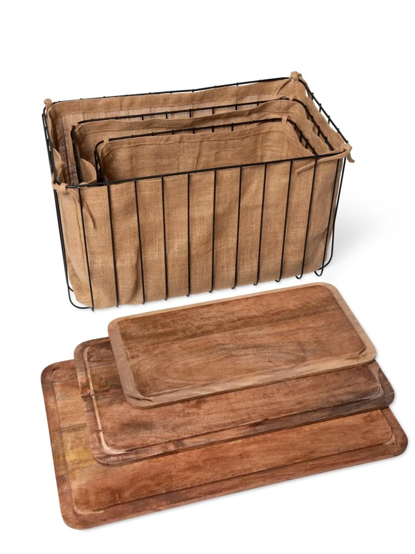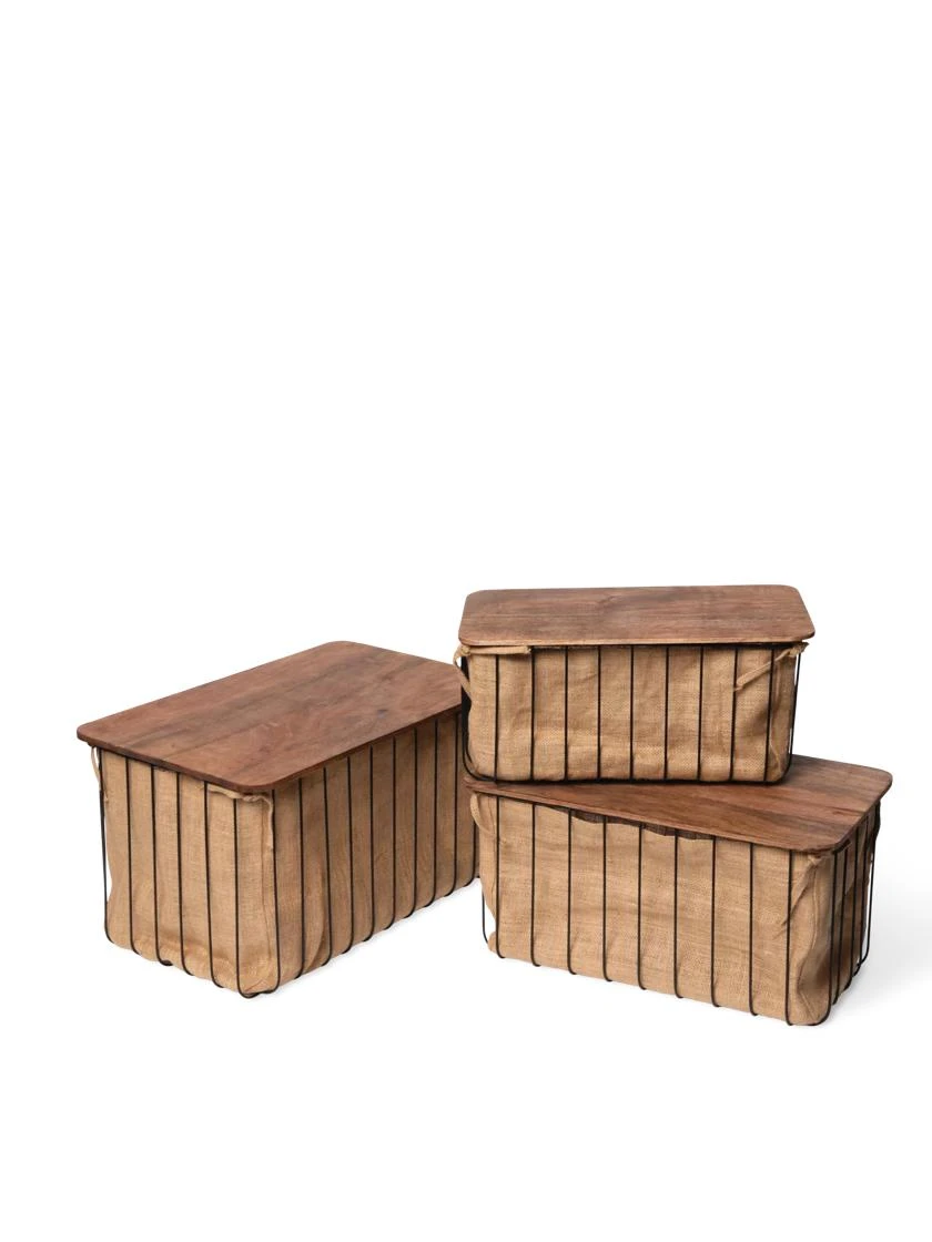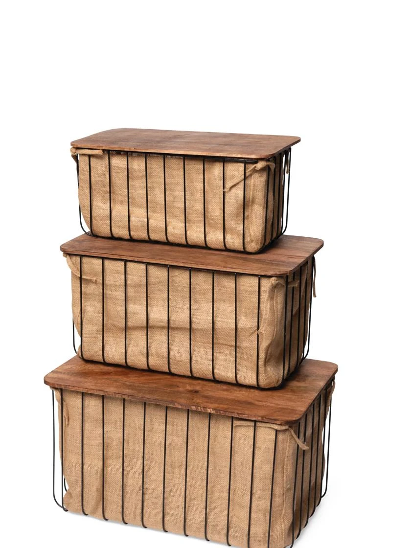 - Metal wire bins, jute liners, mango wood covers